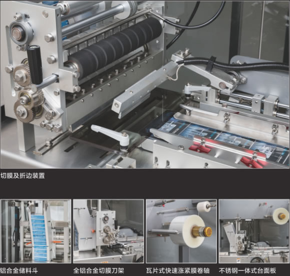 1.本机是一款全自动高速透明膜包装设备,采用平推式包装方式,所有裹包及热封动作均凸轮传动完成,具有速度快、运行稳定等特点。